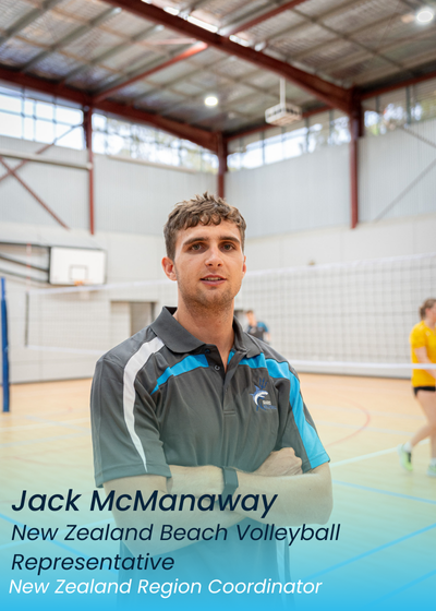 Indoor volleyball court with a man in a sports uniform standing in front, arms crossed, posing confidently. Volleyball net and players in the background. Text overlay with "Jack McManaway, New Zealand Beach Volleyball Representative, New Zealand Region Coordinator."